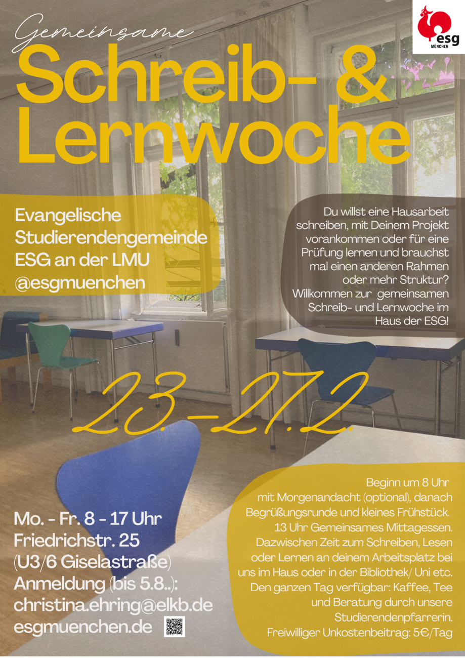 Du willst eine Hausarbeit schreiben, mit Deinem Projekt vorankommen oder für eine Prüfung lernen und brauchst mal einen anderen Rahmen oder mehr Struktur? Willkommen in der gemeinsamen Schreib- und Lernwoche im Haus der ESG!